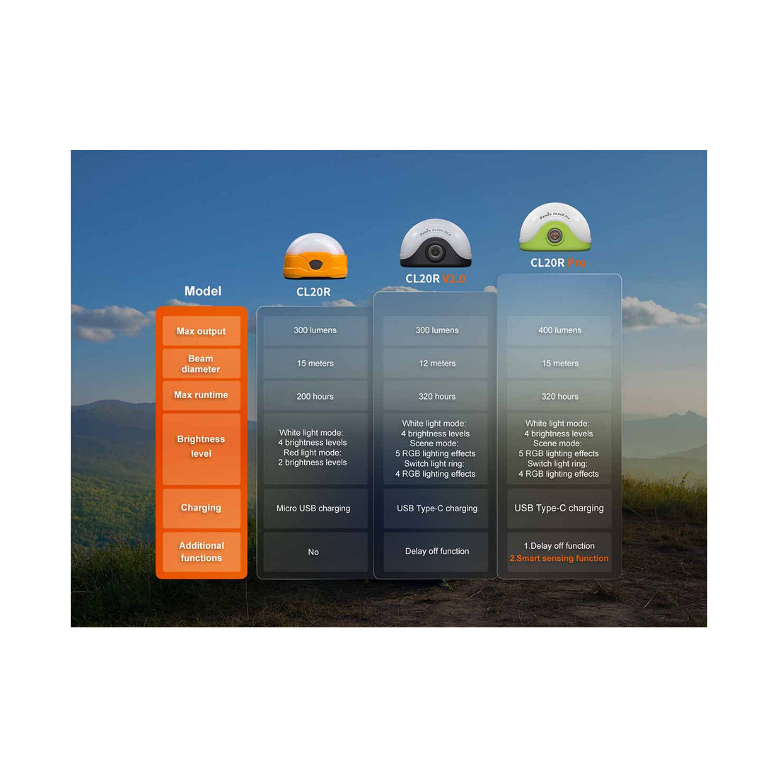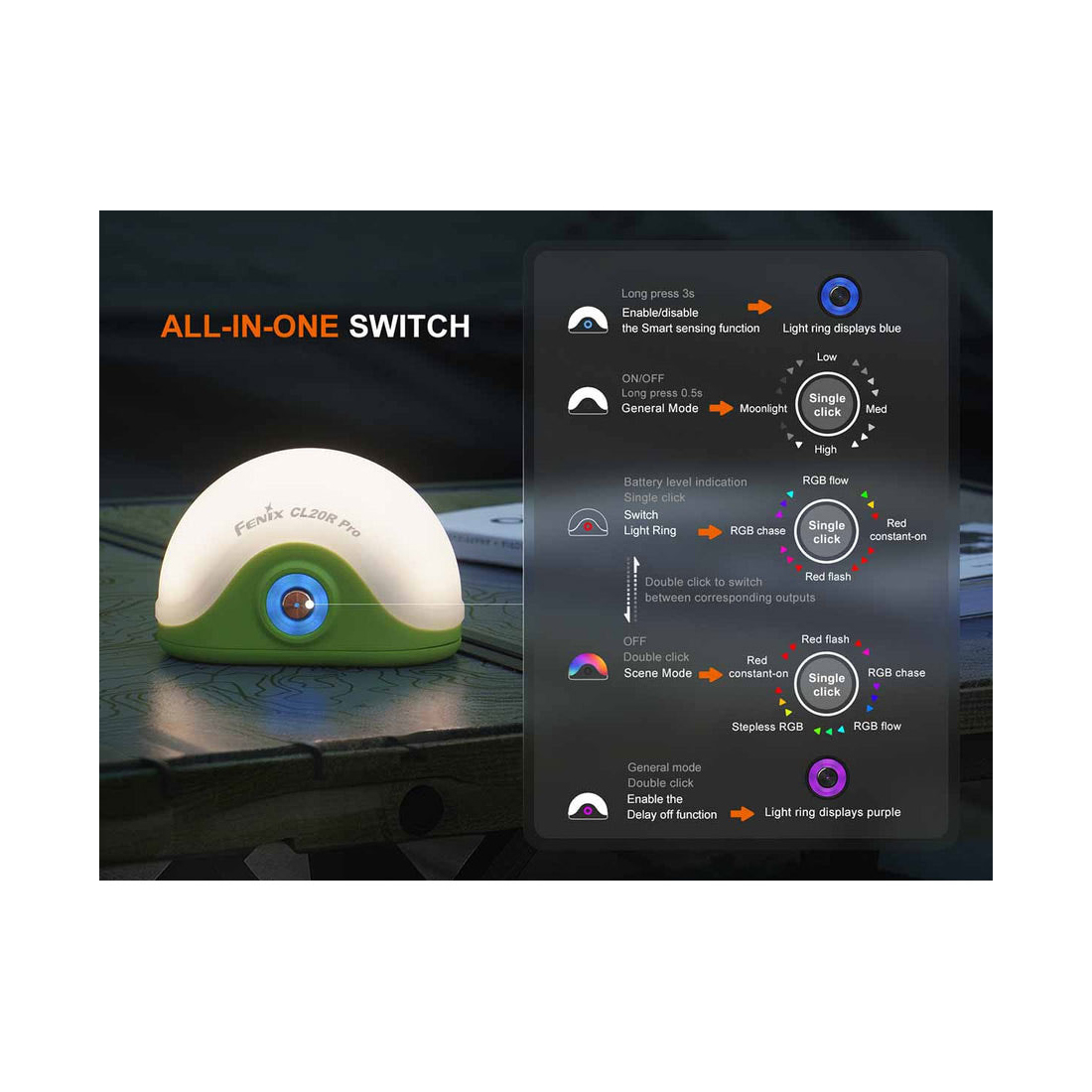 Το Fenix CL20R PRO Rechargeable Lantern έχει σχεδιαστεί για όσους θέλουν περισσότερη διασκέδαση και μεγαλύτερη ευελιξία φωτισμού από τον φανάρι τους. Με απόδοση έως 400 lumen και μέγιστη διάρκεια λειτουργίας 320 ώρες, συνδυάζει συμπαγές μέγεθος με σοβαρές δυνατότητες — διαθέτει ακόμη και αισθητήρα κίνησης, που ενεργοποιεί αυτόματα το φανάρι όταν κάποιος μπει στον χώρο ή στη σκηνή.