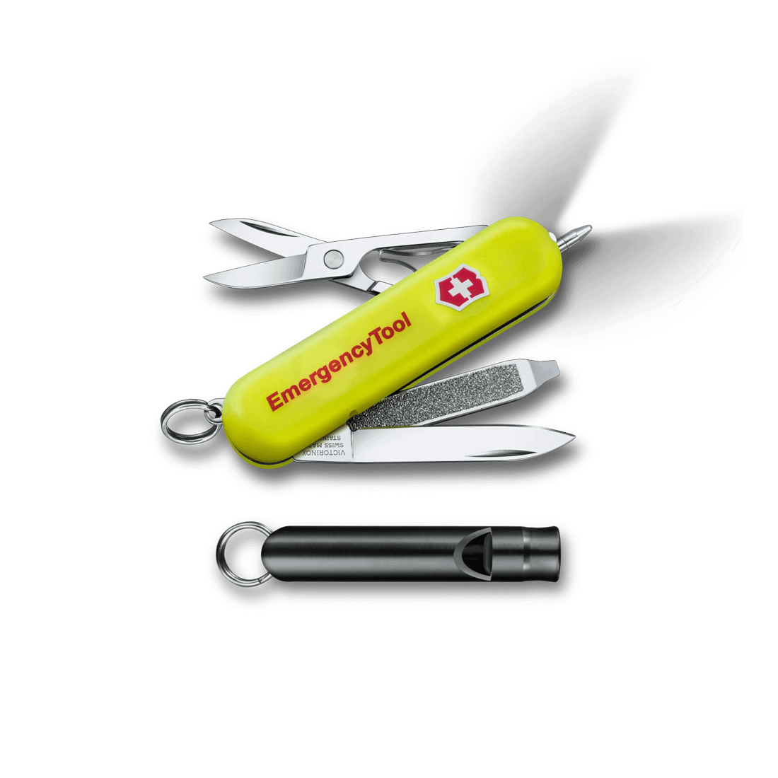 For situations where power supply is uncertain – whether due to natural events or infrastructure failure – we developed a specialised model based on the Signature Lite, which features an integrated light function. This palm-sized, multifunctional tool includes a glow-in-the-dark handle for easy visibility in low-light conditions and a whistle to help signal your location during emergencies.