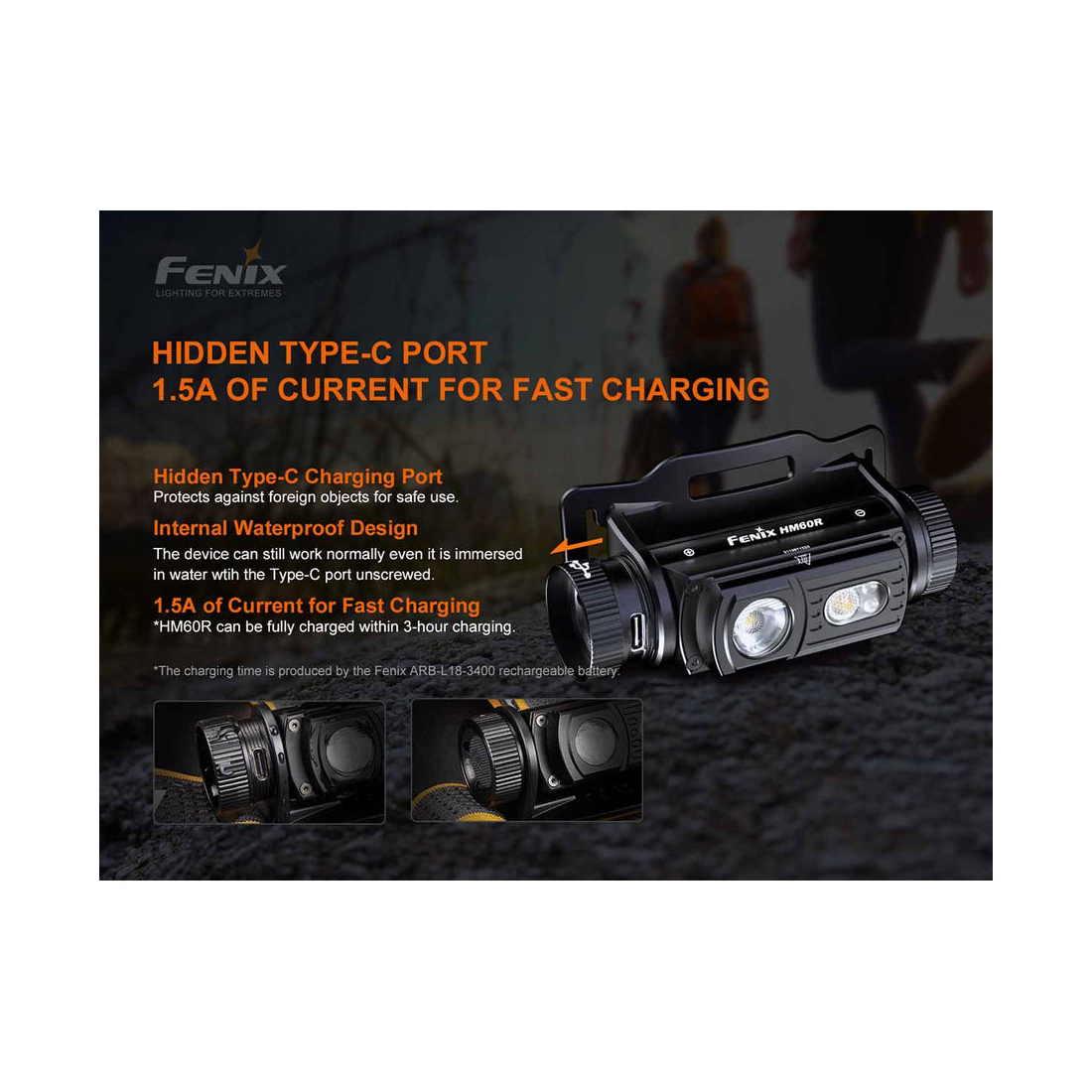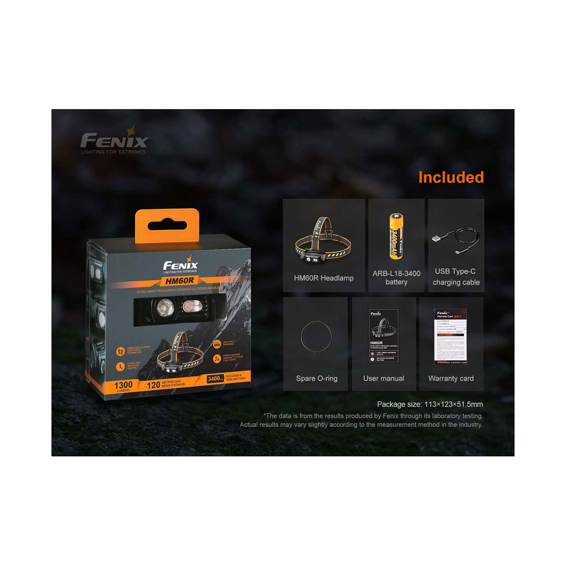 • Included: Fenix ARB-L18-3400 li-ion battery, USB Type-C charging cable, spare O-ring