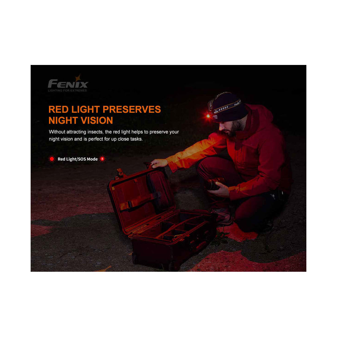 he Fenix HM60R Rechargeable Headlamp is a great all-purpose headlamp which features three types of light—a spotlight for long distance illumination, a floodlight with neutral white light for better color rendering, and red light to preserve your night vision and for up-close tasks.