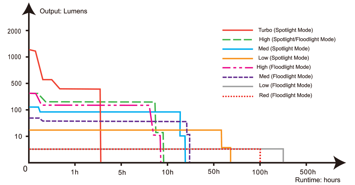 • Lighting Modes: 4 spotlight levels, 3 floodlight levels, red light and red SOS