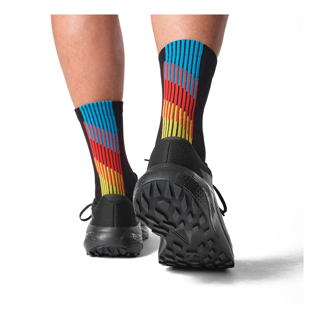 - V-shaped lugs: Outsole lug design for deep penetration and multi-directional grip, improving traction on soft surfaces such as mud and loose ground.