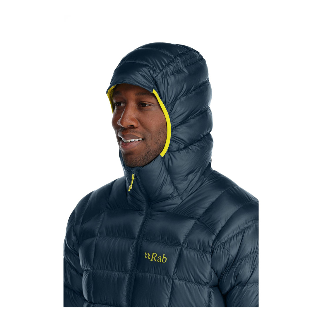 - Down-filled hood with part-elasticated opening and stiffened peak.
