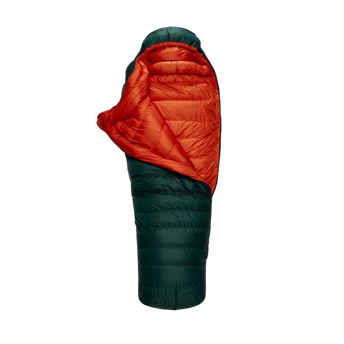 The generous mummy fit with wide foot box provide a spacious feel for an easy night’s sleep, and the close-fitting neck baffle keeps the heat in when the temperature drops. It has a ¾ length main zip with a down filled baffle to keep out the draught.