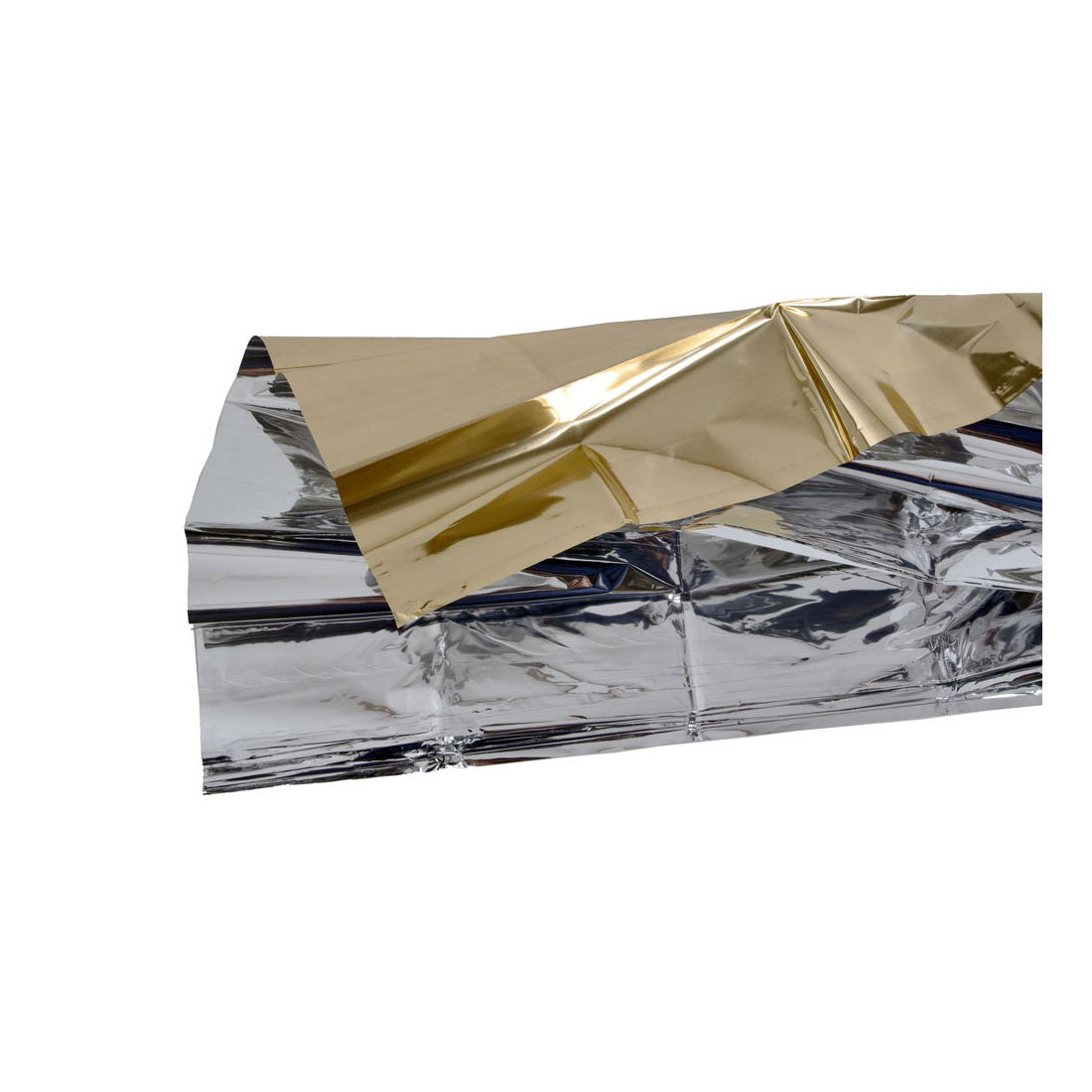 To keep warm, please turn the silver side towards the person and wrap him/her completely in the emergency blanket (leave face free!). Do not wrap too tightly. The rescue blanket warms only by reflecting the body's heat radiation. The emergency blanket should close tightly and not flap. In ice and snow, the gold-coloured side of the blanket is clearly visible and is usually understood as a call for help. To protect against overheating, the emergency blanket can be stretched out as a sunshade but the person should not be wrapped up. If the silver side is facing the body, the body heat is reflected and hypothermia is prevented. If the golden side is facing the body, strong sun rays are reflected and heat is kept away from the body.