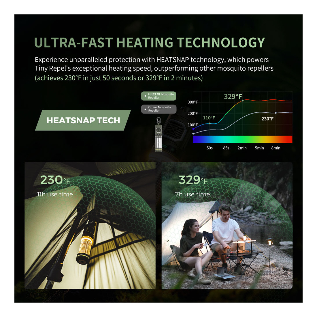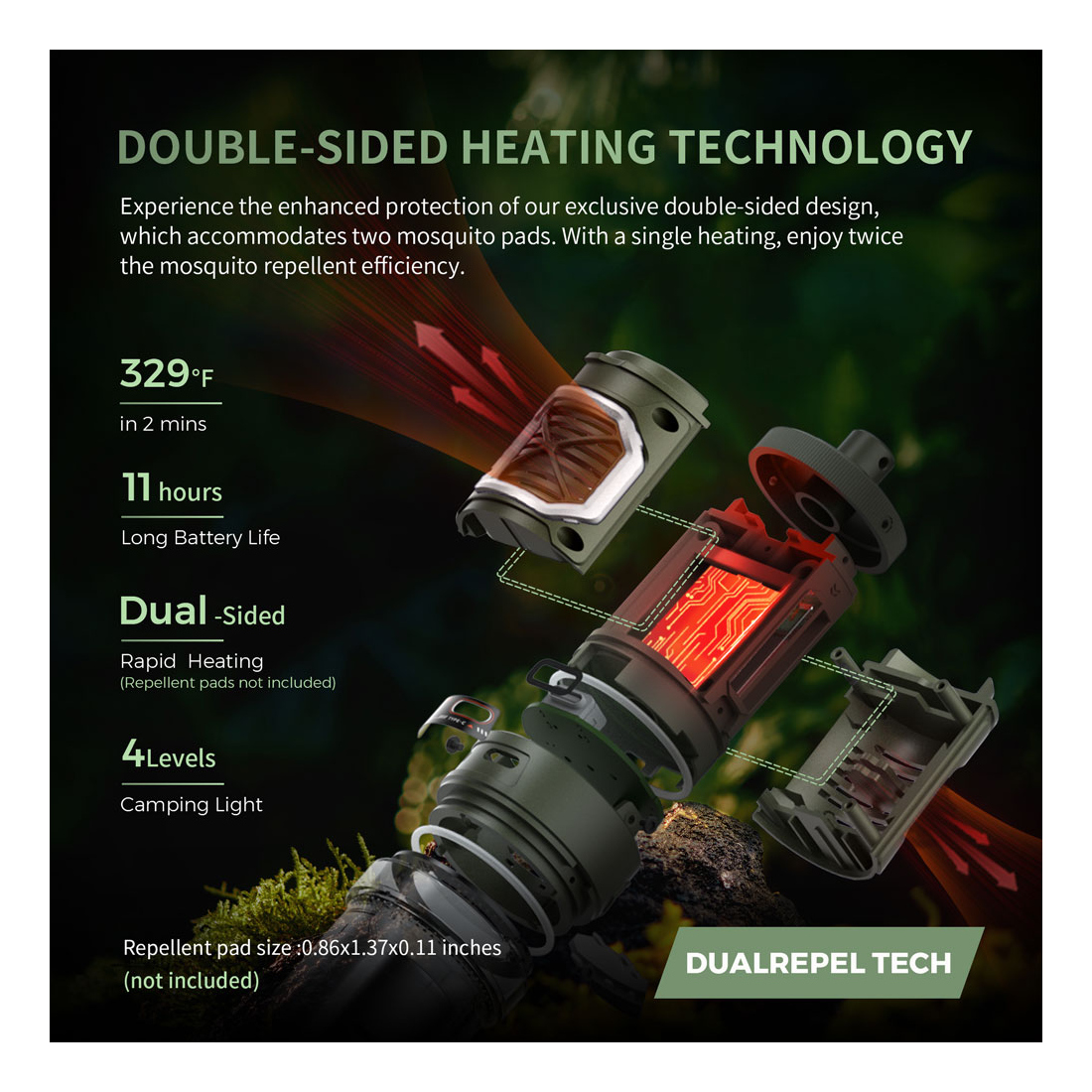 Exclusive Double-sided design with the latest DUALREPEL™ technology distributes the heat evenly to perform the best. The heating effect of Flextail's TINY REPELLER is twice as many as other brands. Quickly reaches 110°C in only 50 seconds. It hits 165°C with low power consumption and triggers an extensive 30-FT protection zone. Fast heating system (110°C for 50 seconds or 165°C for 2mins) with smart thermostat provides you 360-degree all-round protection. The auto shut-off function can effectively avoid overheating problems in abnormal situations. Our TINY REPELLER is Independently tested and EPA-reviewed for safety & effectiveness.