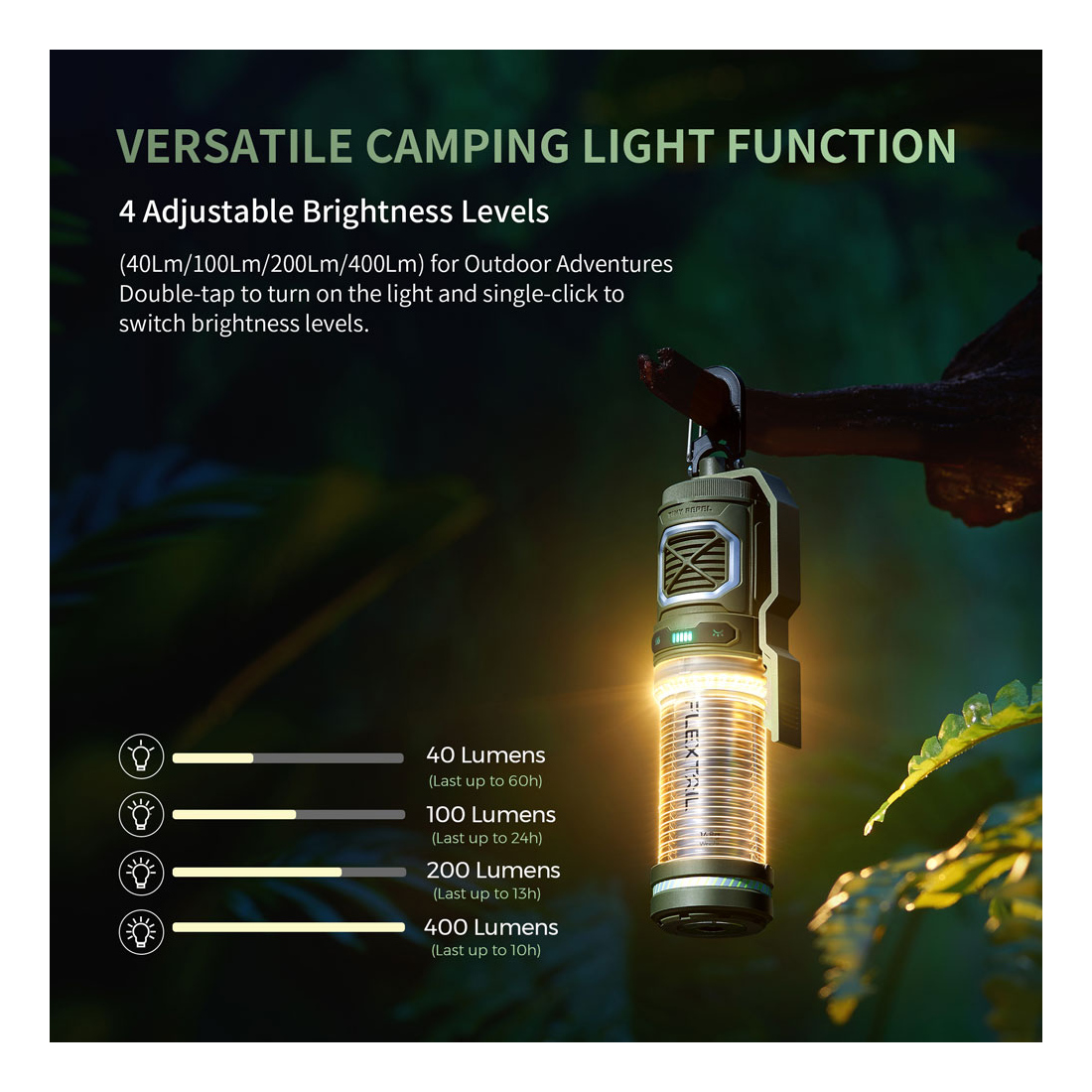 FLEXTAIL TINY REPELLER Stepless dimming better meets different brightness needs. 400 lumens full brightness can continuously last up to 9 hours, if you do not need it that bright, dim it down to 50 lumens for 50 hours! The camping light can be used alone or with mosquito repellent.