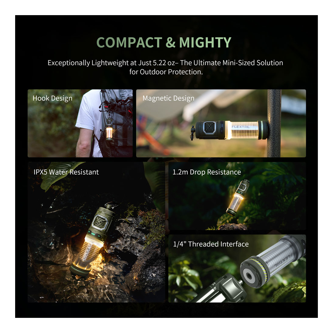 FLEXTAIL mosquito repellent is ultralight and easy to carry with only 148g (5.2 oz). It can be set to anywhere by using a built-in magnet, metal handle, or being mounted to a tripod. The built-in magnet has a strong force, which allows your TINY REPELLER can be strongly attracted by iron, steel, nickel, and other ferromagnetic material.