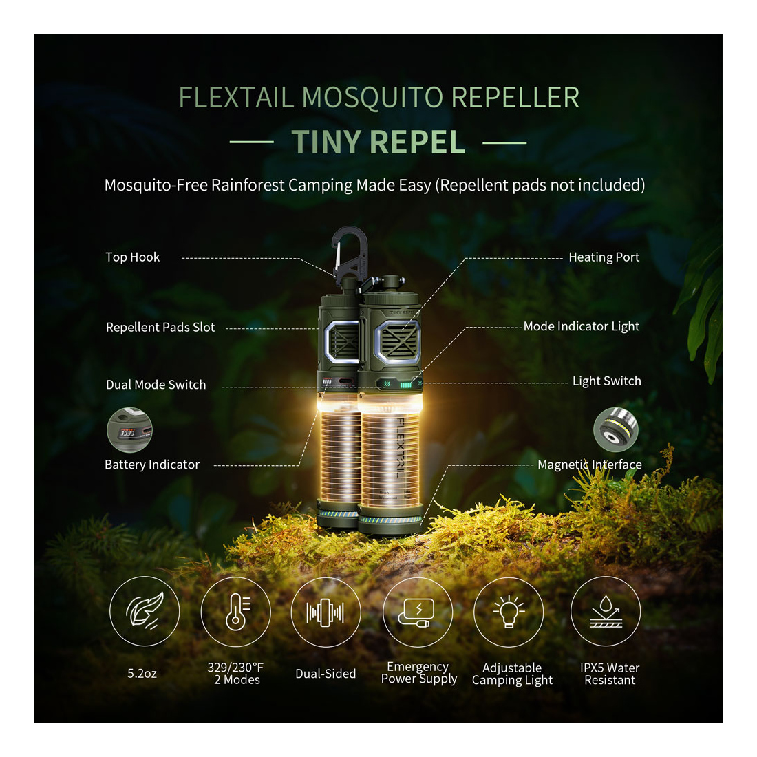 FLEXTAIL TINY REPELLER creates a 30-foot zone of protection against mosquitoes. Ideal for backpackers, campers, hunters, and other outdoors people. You can insert mats into both sides of the device, and also use only one side to insert mat based on your needs.