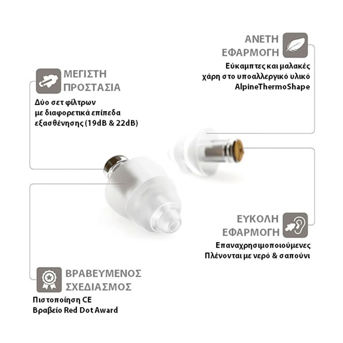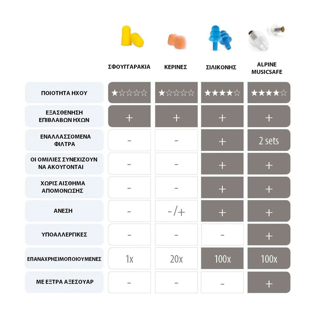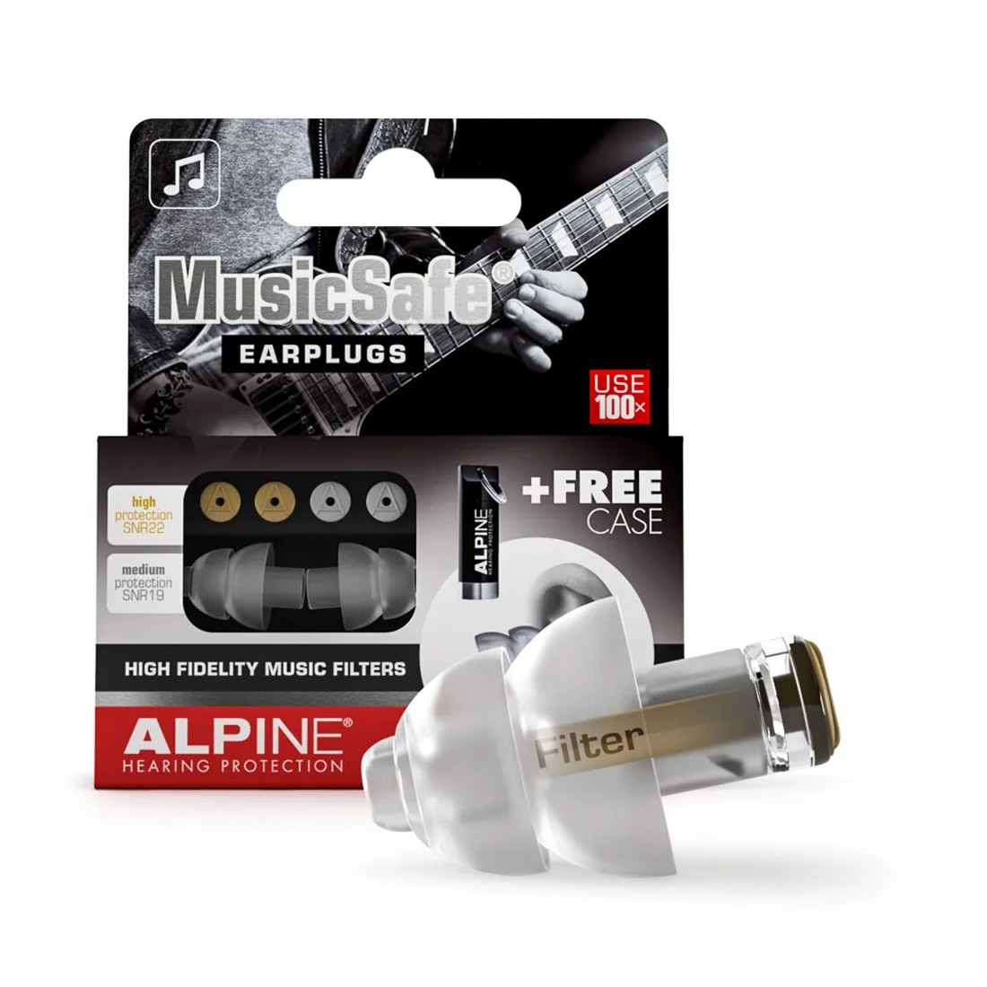 - Music earplugs: Prevent permanent hearing loss and annoying tinnitus with MusicSafe earplugs, Alpin'e number one choice for professional musicians. Made from soft, silicone-free material that adapts to your ear canal, these earplugs mold to your ear within minutes, significantly improving comfort. Each pack comes with a luxury travel pouch, two sets of exchangeable filters, and an Alpine insertion aid.